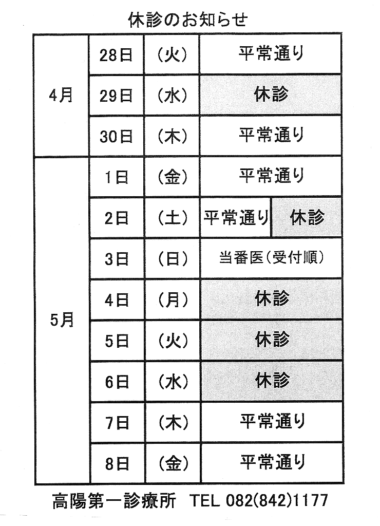 4月30日(水)から5月3日(日)までは診療を行い、5月4日(月)から5月6日(水)が休診、5月7日(木)以降が通常通りの診療となります。ご迷惑をお掛けしますが、ご理解のほどをよろしくお願いします。
