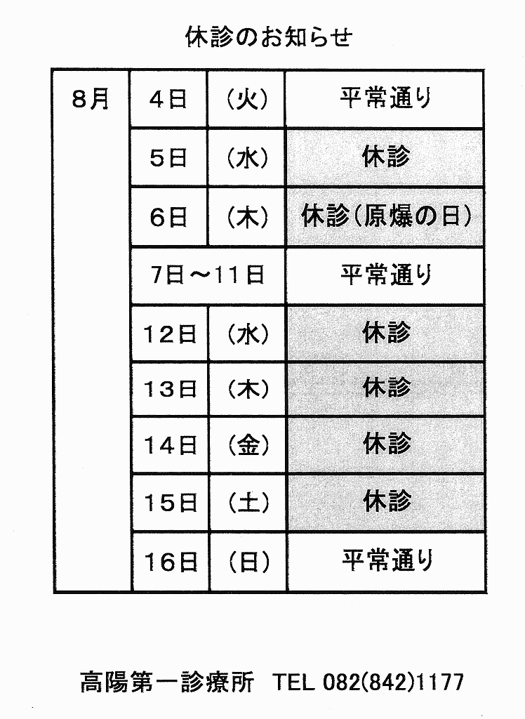 8月6日(木)と8月12日(水)から8月15日(土)は休診となります。ご迷惑をお掛けしますが、ご理解のほどをよろしくお願いします。