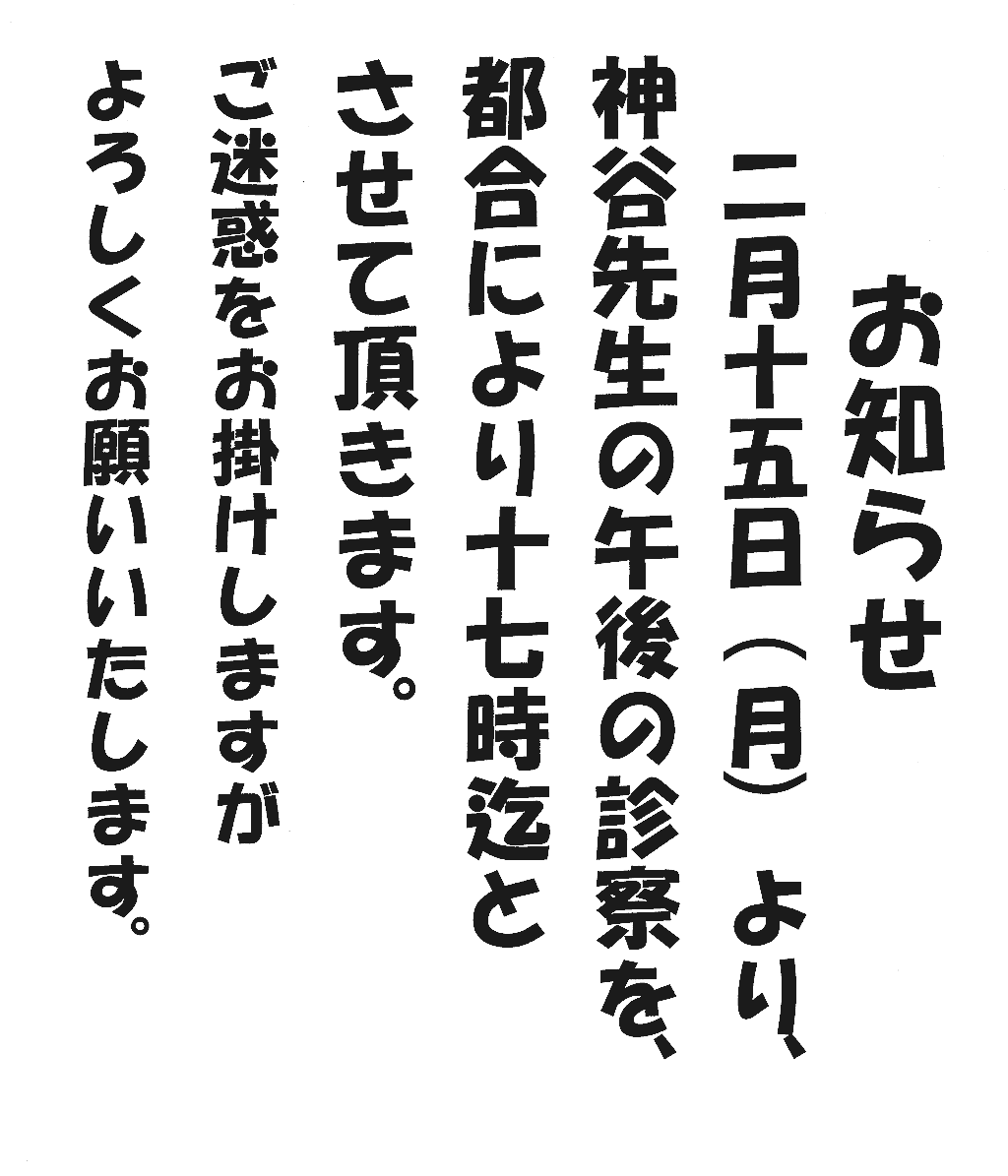 02月15日(月)より神谷先生の午後の診察を都合により17時までとさせていただきます。ご迷惑をお掛けしますが、ご理解のほどをよろしくお願いします。