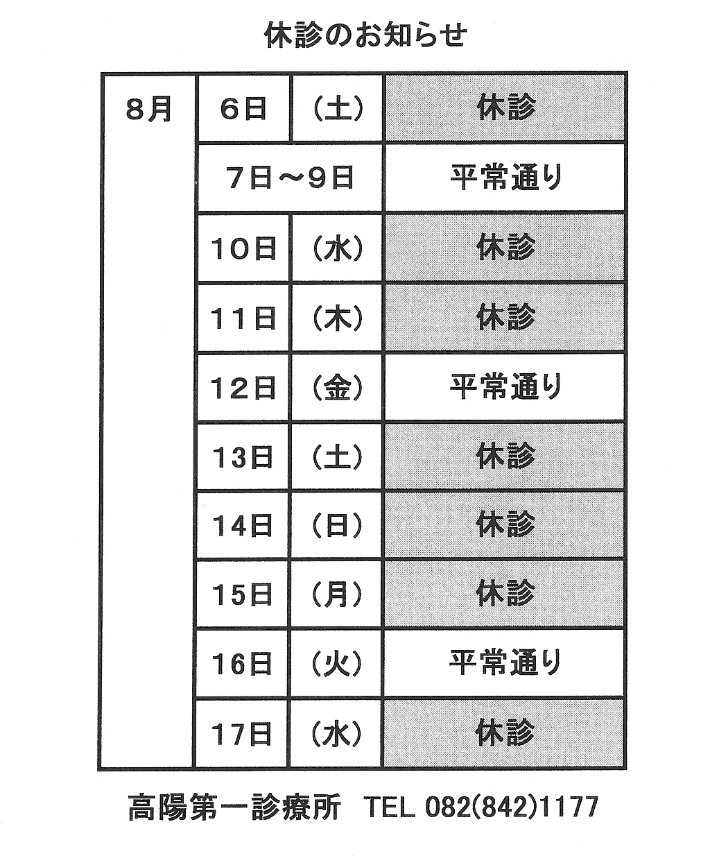 8月6日(土)、8月10日(水)、8月11日(木)、8月13日(土)~8月15日(月)が休診となります。ご迷惑をお掛けしますが、ご理解のほどをよろしくお願いします。